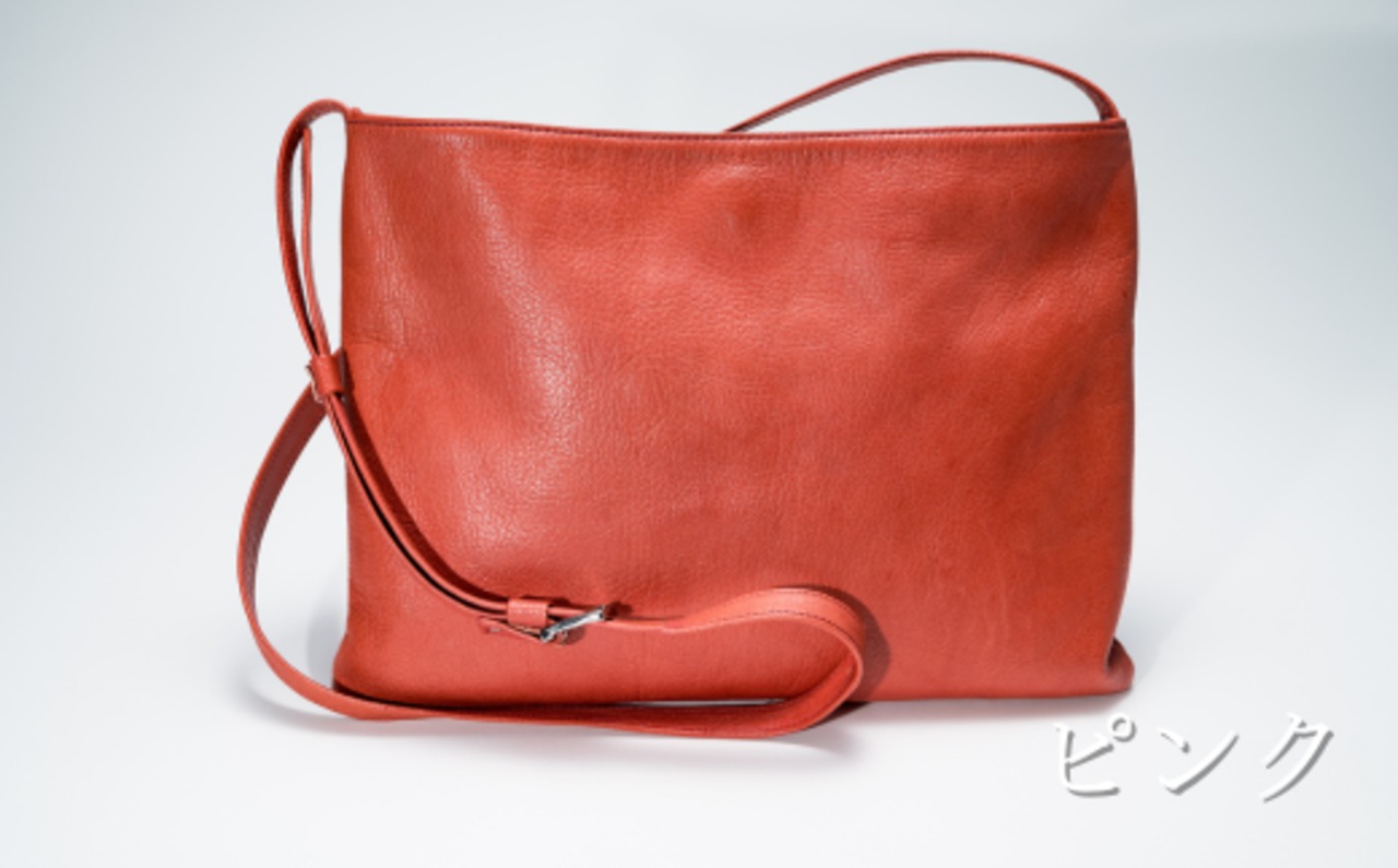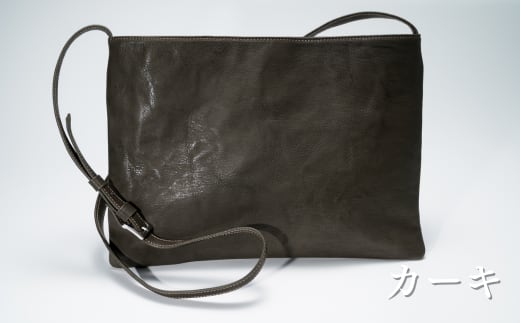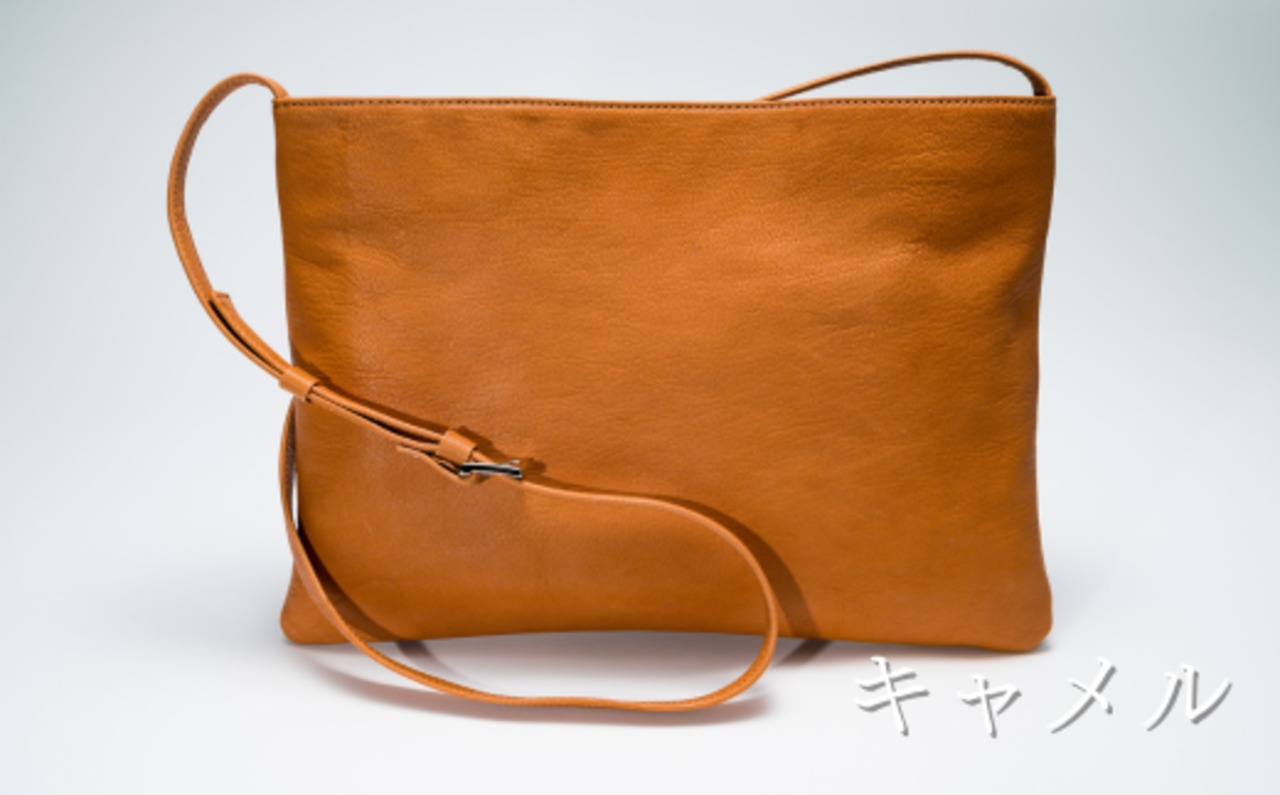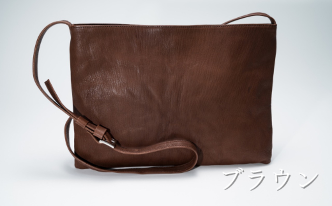 こちらは、4色から選べる横長サコッシュです。手もみで仕上げたオイルヌメゴート革を使用しており、上質な質感が魅力のアイテムです。ゴート(山羊)革のため耐久性も抜群。